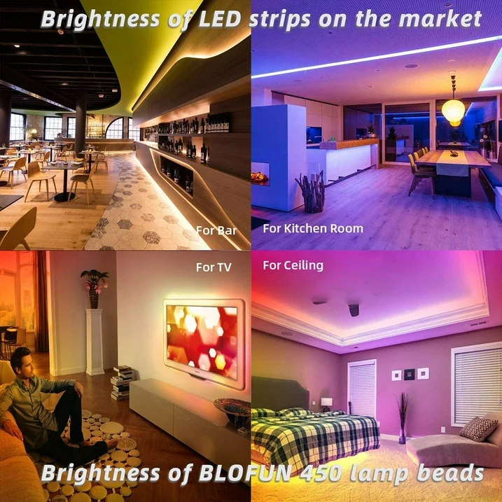 • Upgraded APP Control & Brightness Adjust】- Easily dim and switch the light via smart phone app control, play with 16 million colors, multiple dynamic mode and control color changing speed. RGB led strip also specially set 6 colors for DIY.Led tape light has ultra-high brightness SMD5050, it can be adjust brightness from 1% to 100%, you can show the any brightness you want.