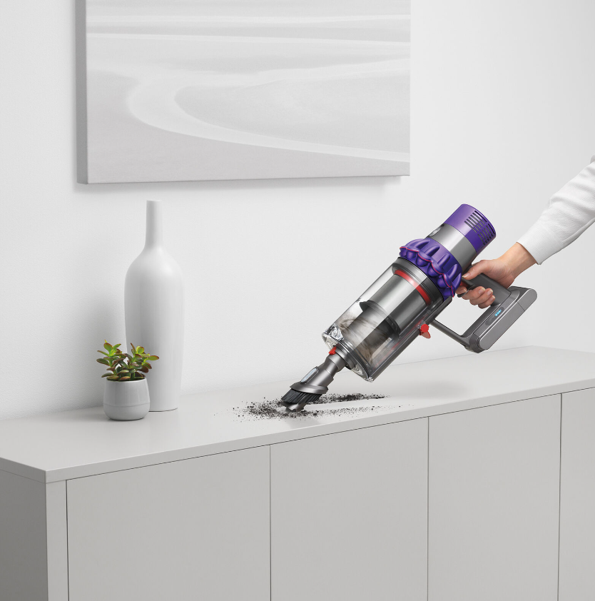 Powered by the Dyson digital motor V10, 14 cyclones, Fade-free power, Whole-machine filtration, Acoustically engineered, In-line configuration, Quickly transforms to a handheld, 'Point and shoot' hygienic bin emptying