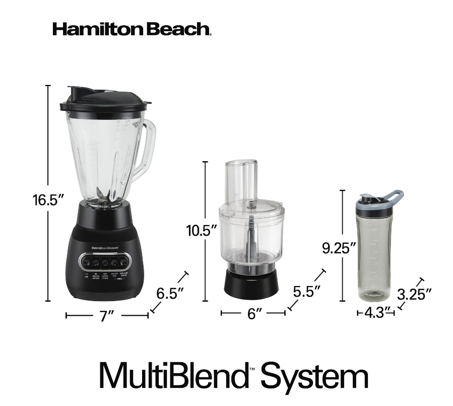 Hamilton Beach Multi Blend Kitchen System, 3-in-1 Blender with Food Processor Attachment, 52 oz. Blending Jar, and 20 oz. Travel Jar, 58176: